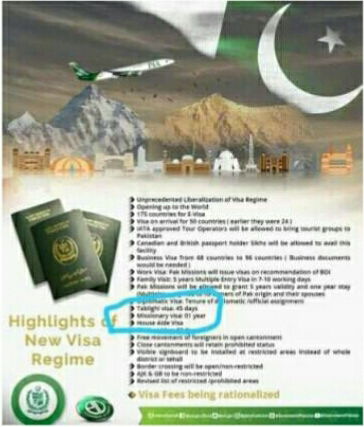 جبکہ ماسواے مذہبی اقلیتی فرقوں کے تبلیغی ویزہ میں بھی نظرثانی کی ہے، تبلیغ کیلئے پاکستان کا ویزہ 45 دن مقرر ہے ۔