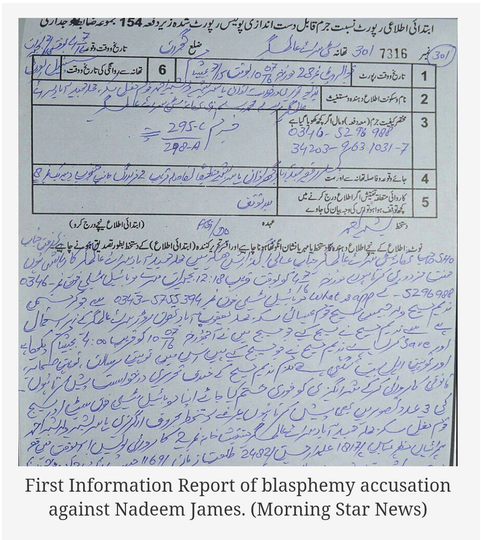 First Information Report of blasphemy accusation against Nadeem James. (Morning Star News)