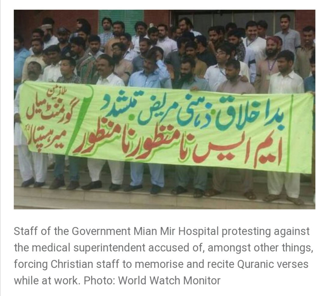 Pakistan Lahore, Staff of the Government Mian Mir Hospital protesting against the medical superintendent accused of, amongst other things, forcing Christian staff to memorise and recite Quranic verses while at work. Photo: World Watch MonitorThe medical superintendent of a hospital in Pakistan has been accused of forcing its Christian staff to memorise Quranic verses. Article 20 of the Pakistan Constitution guarantees that no-one can be forced into any religious practice or belief against his/her own faith.