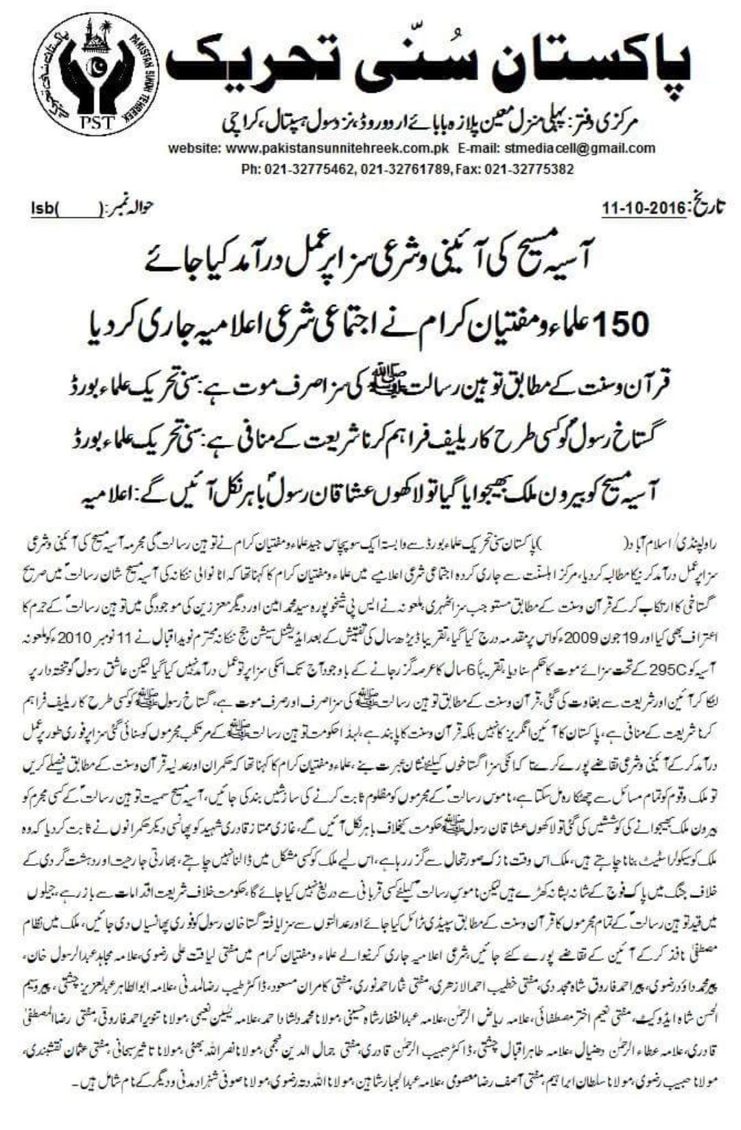 Thousands of angry Muslims blocked roads and main highways in several cities of Pakistan, including Islamabad, Rawalpindi, Lahore, Gujranwala, Faisalabad, Bahawalnagar, Bahawalpur, Karachi and Hyderabad, and protested against Bibi’s acquittal.