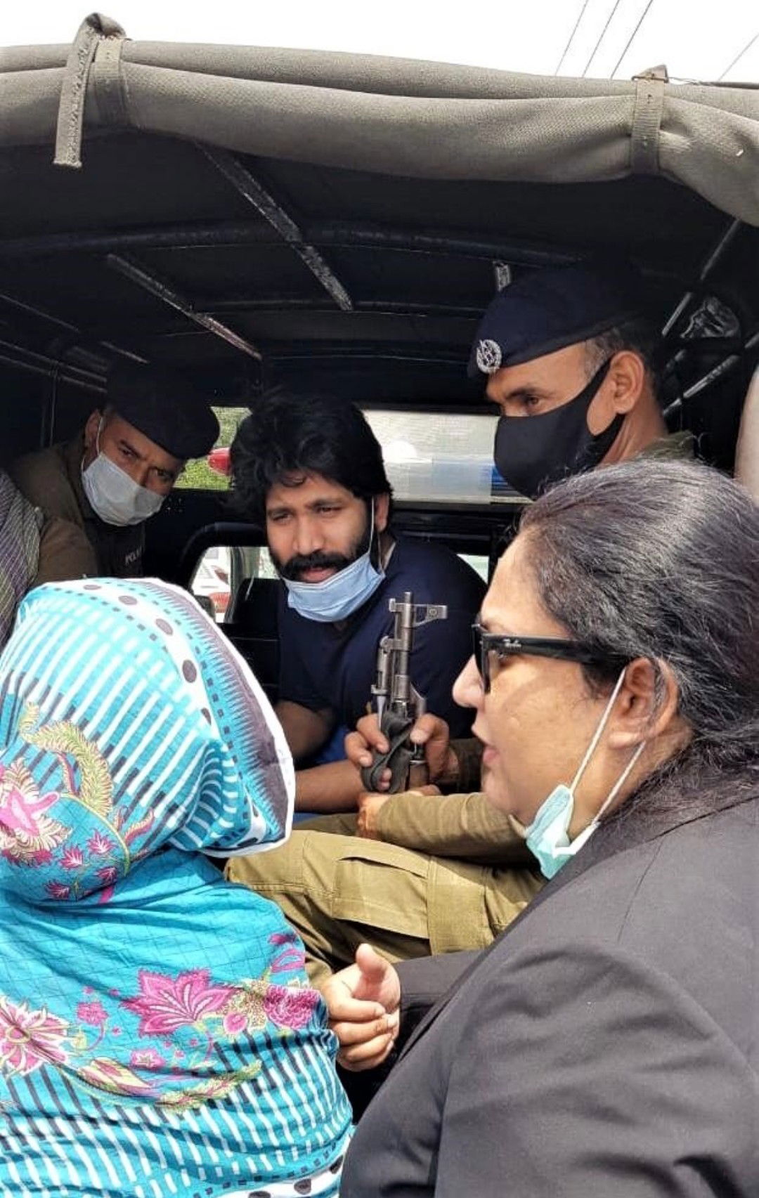Salamat Mansha Masih (center) sees his mother and former attorney (right) on arrival at jail in Lahore on April 23, 2021.