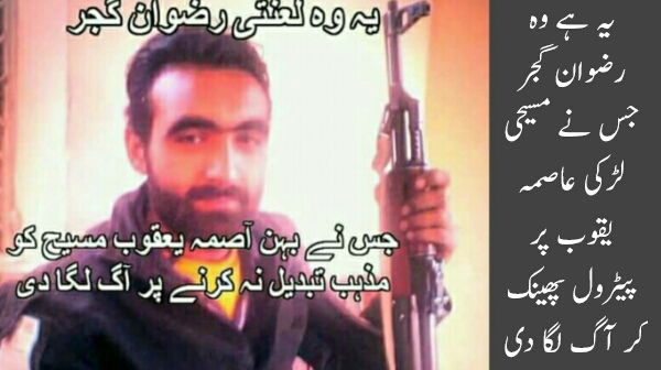 رضوان گجر جو علاقے میں بپھرا ہوا غنڈہ ہے اس نے مسیحی لڑکی عاصمہ یقوب پر تیزاب پھینک کر جلا ڈالا جس کو فوری طور پر گورنمنٹ علامہ اقبال میموریل ٹیچنگ ہسپتال سیالکوٹ منتقل کیا گیا جہاں سے ڈاکٹروں نے مریضہ کو میو ہسپتال لاہور ریفر کر دیا۔